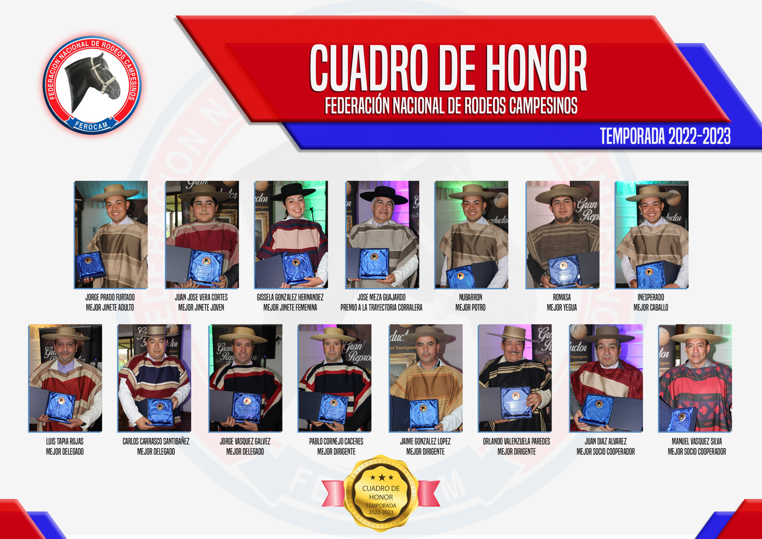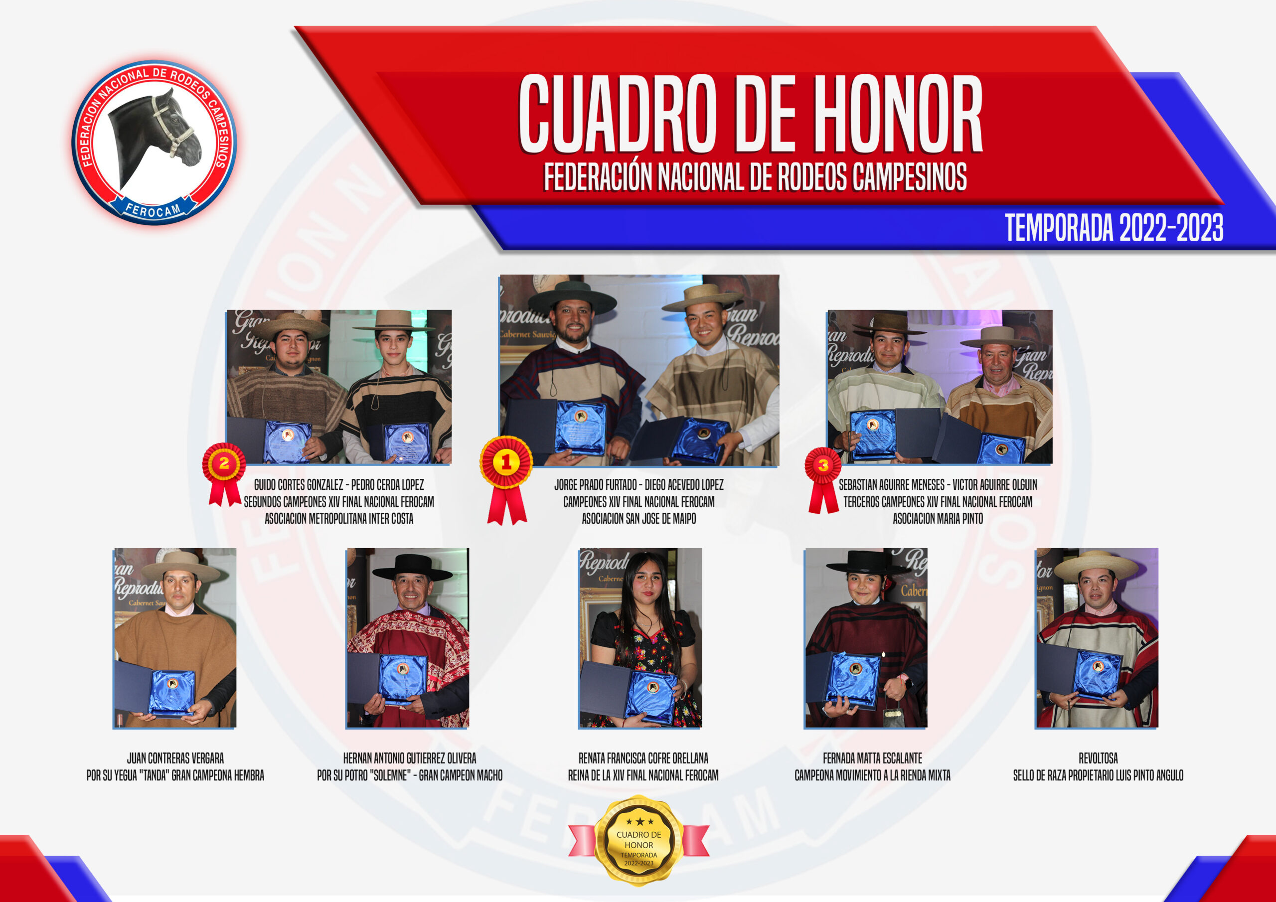 | HERNAN ANTONIO GUTIERREZ OLIVERA | POR SU POTRO “SOLEMNE” – GRAN CAMPEON MACHO FINAL NACIONAL DE EXPOSICIONES FEROCAM | ASOCIACION MARIA PINTO |